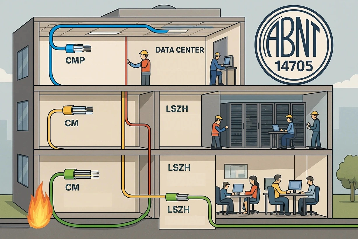 A NBR 14705, intitulada “Cabos internos para telecomunicações – Classificação quanto ao comportamento frente à chama”, é uma norma técnica crucial para a segurança contra incêndios em instalações de telecomunicações no Brasil. Elaborada pela ABNT (Associação Brasileira de Normas Técnicas), sua última revisão ocorreu em 2010, incorporando práticas avançadas de segurança e alinhando-se com padrões internacionais. É importante notar que a ABNT é o órgão responsável por criar e atualizar as normas técnicas brasileiras, garantindo que elas reflitam o estado da arte em termos de tecnologia e segurança. Ainda em 2025, deverá ser publicada a mais nova revisão dessa norma, com novidades especialmente em relação à classificação LSZH (leia mais abaixo).