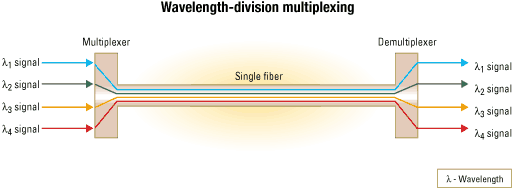 - Comprimento de onda: Representa a “cor” (comprimento de onda) da luz na fibra. Cada cor (canal) carrega um fluxo de dados independente.
